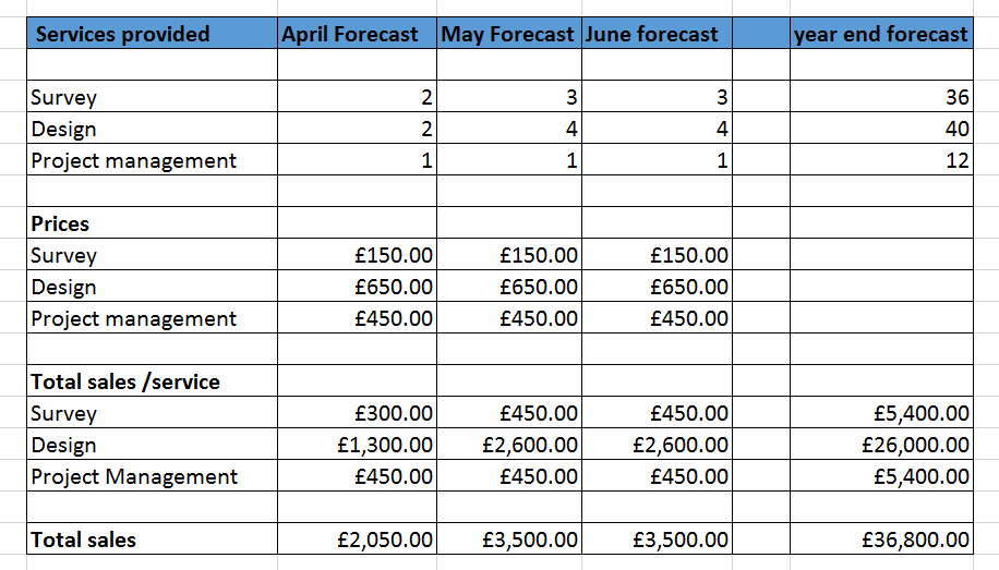we established the need to set goals for motivation and to drive higher performance. It is important to break down long term goals into shorter, sub goals. Well, the sales forecast sets that out for you in black & white. Starting with a £120,000 year end of goal is daunting, yet breaking that down to £10,000 per month and then by product sales enables to you see how realistic your goal really is.
