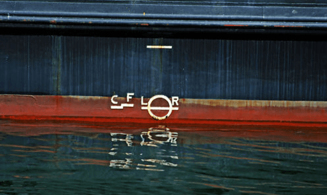 The Plimsoll line is a mark on the hull of a merchant ship, it shows the maximum capacity load the ship may carry. The depth to which a boat can be safely loaded to maintain buoyancy against the hazards of the open sea.